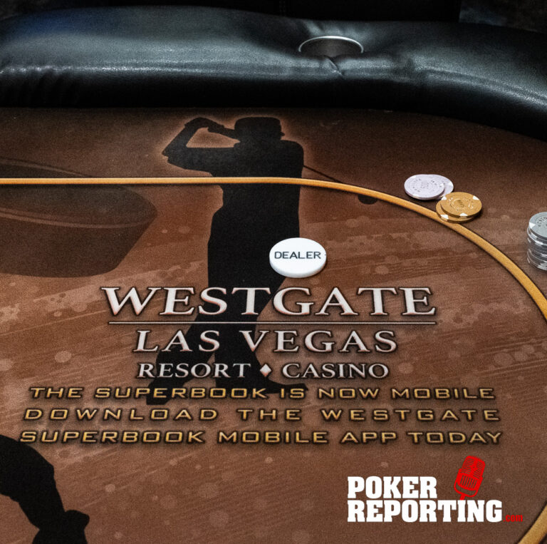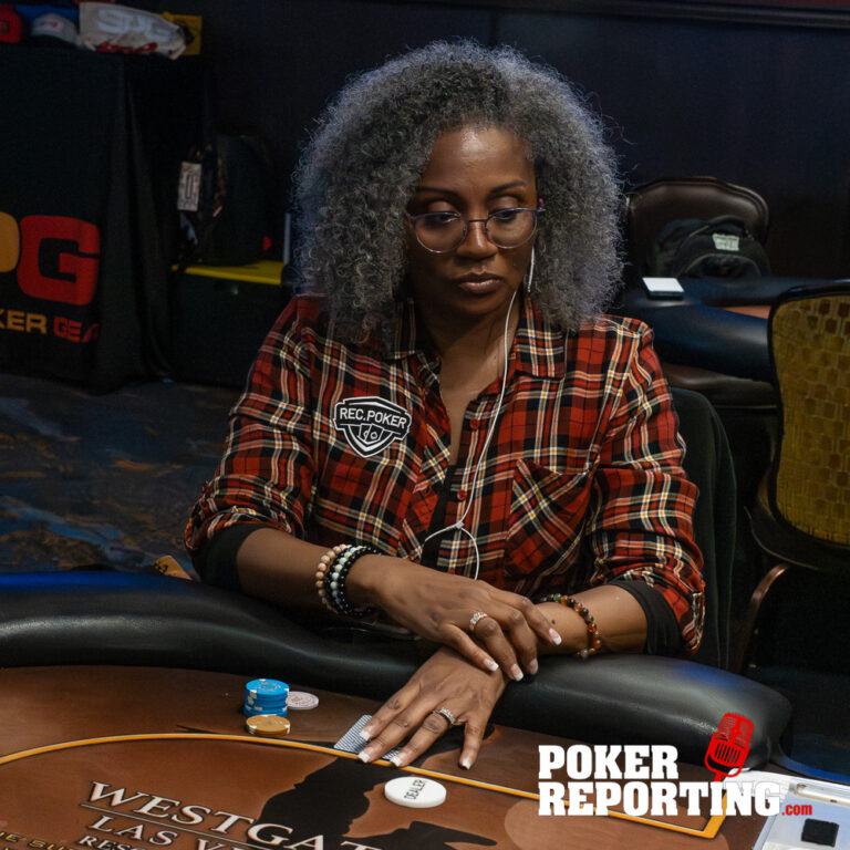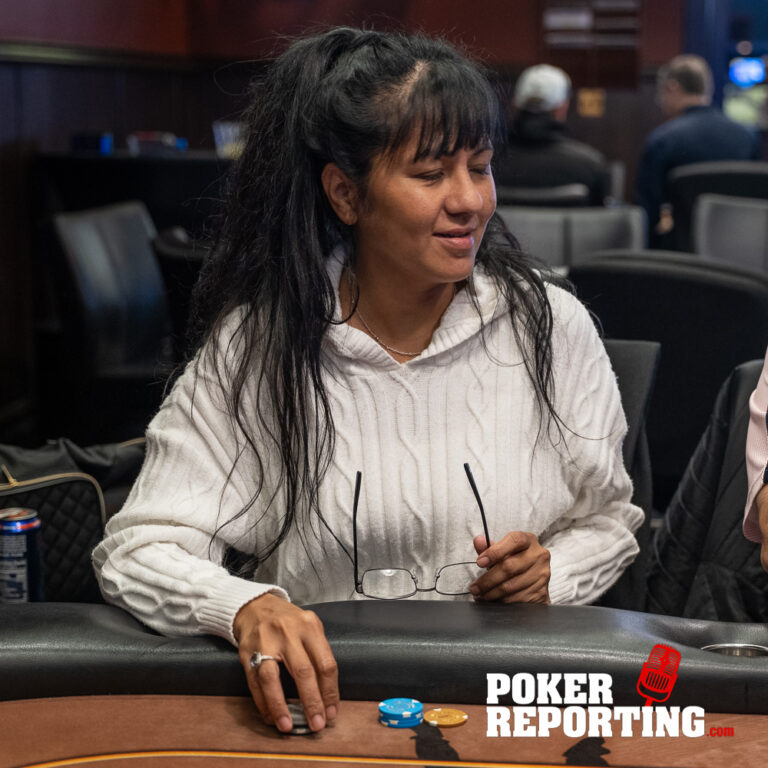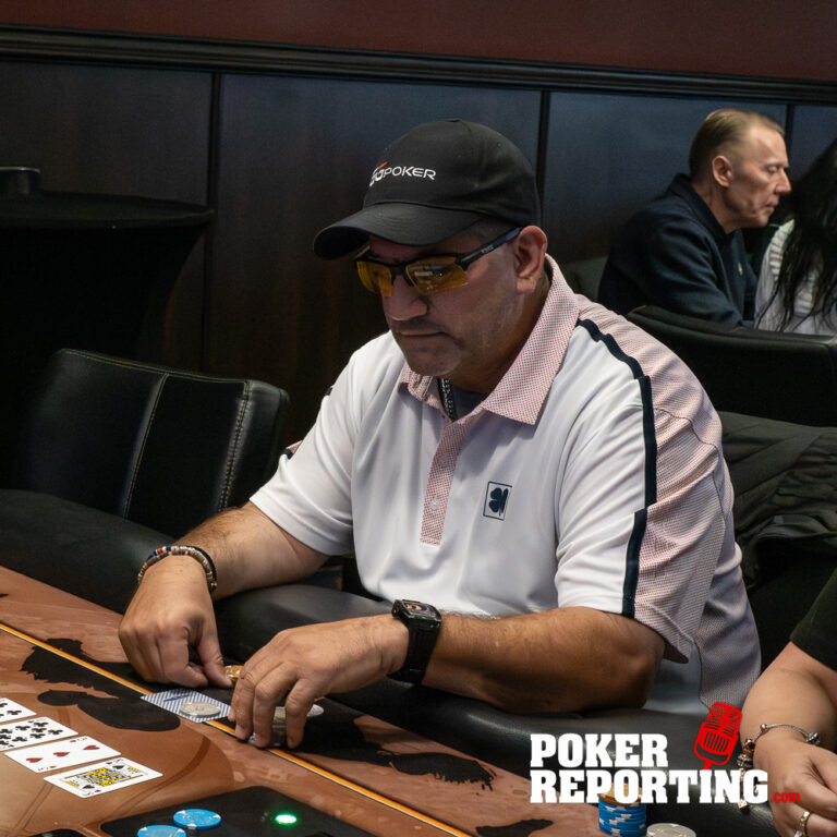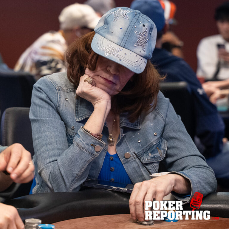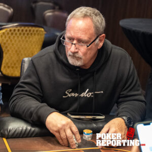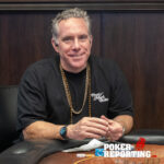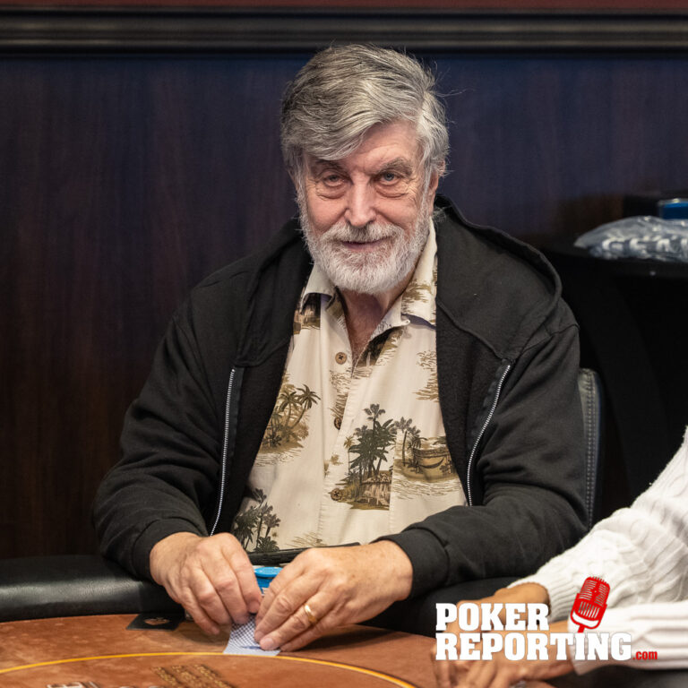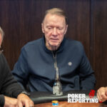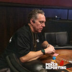 Dennis tables A♥2♥ while Kitty shows A♦K♣. The board runs out 2♠5♠5♦4♦6♣. Dennis pairs his 2♥ on the flop and ultimately makes two pair fives and twos. Kitty finishes with a single pair of fives with ace king kickers, not enough to beat Dennis’s two pair. Dennis doubles through her stack.